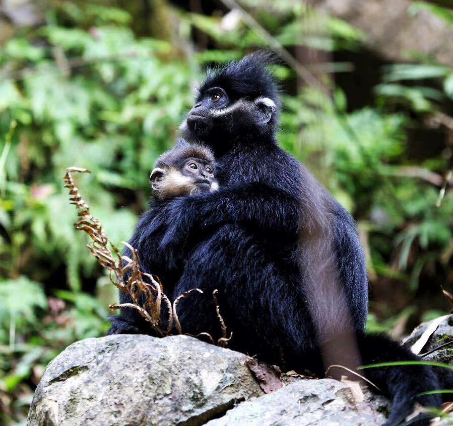 經過長途奔波,快艇行駛到貴州省沿河縣境內的“麻陽河國家級自然保護區”。山上傳來各種表達不同“情緒”的叫聲,在生態環保專業崗位奮斗8年之久的饒振祺朝密林中一指:“快看,那就是黑葉猴!發出‘嘎,嘎’的叫聲,說明它們處在愉快的覓食狀態中;‘噢、噢’就是它們在山林間攀援前進的信號?!碧а弁?,巖石間、樹蔭深處不斷有黑葉猴迅捷地跳躍。它們頭頂冠毛蓬松,通體黑色,兩頰雪白的“絡腮胡”格外醒目,看起來像銀須飄飄的“小老頭”。有的黑葉猴懷里還抱著“金寶寶”——幼猴毛色金黃,隨年齡增大變黑。