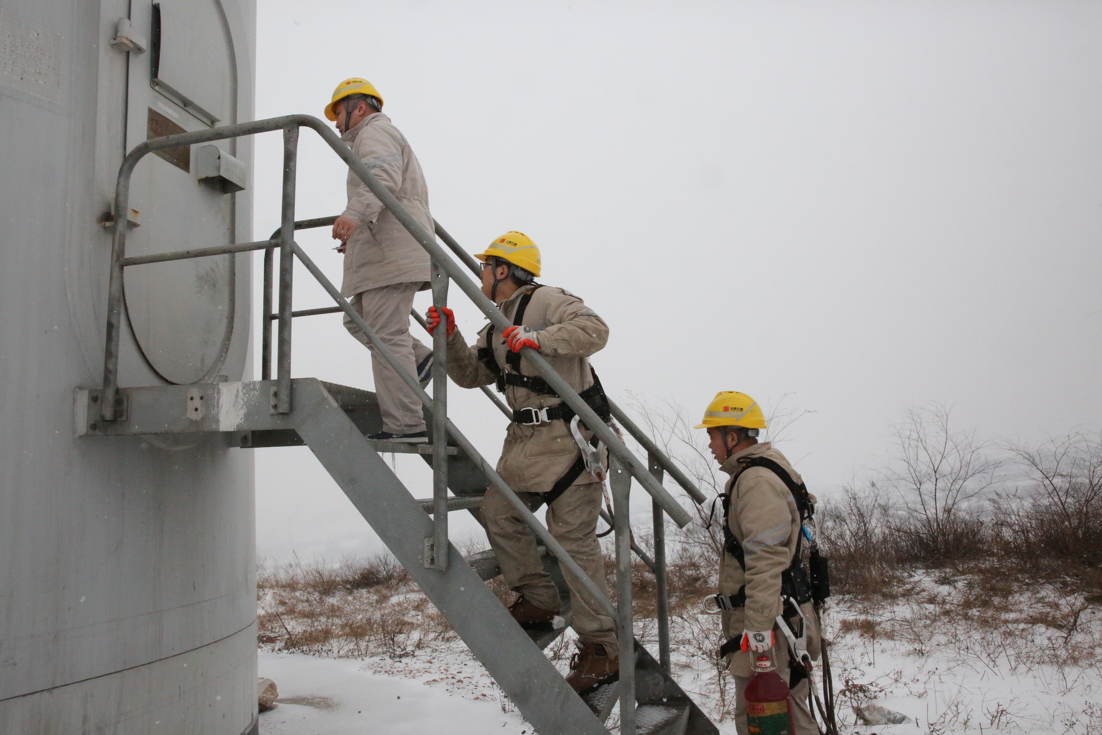 “現在雪(大小)還好點兒,前段時間搶修風機的時候,那雪下的,連路兩邊的護欄都看不見(被雪埋了),就只能憑著記憶去找路。有時候為了防止運輸道路被大雪覆蓋,他們凌晨還出來撒鹽,能干著嘞!”看著三人爬坡的背景,司機李興興感嘆道。