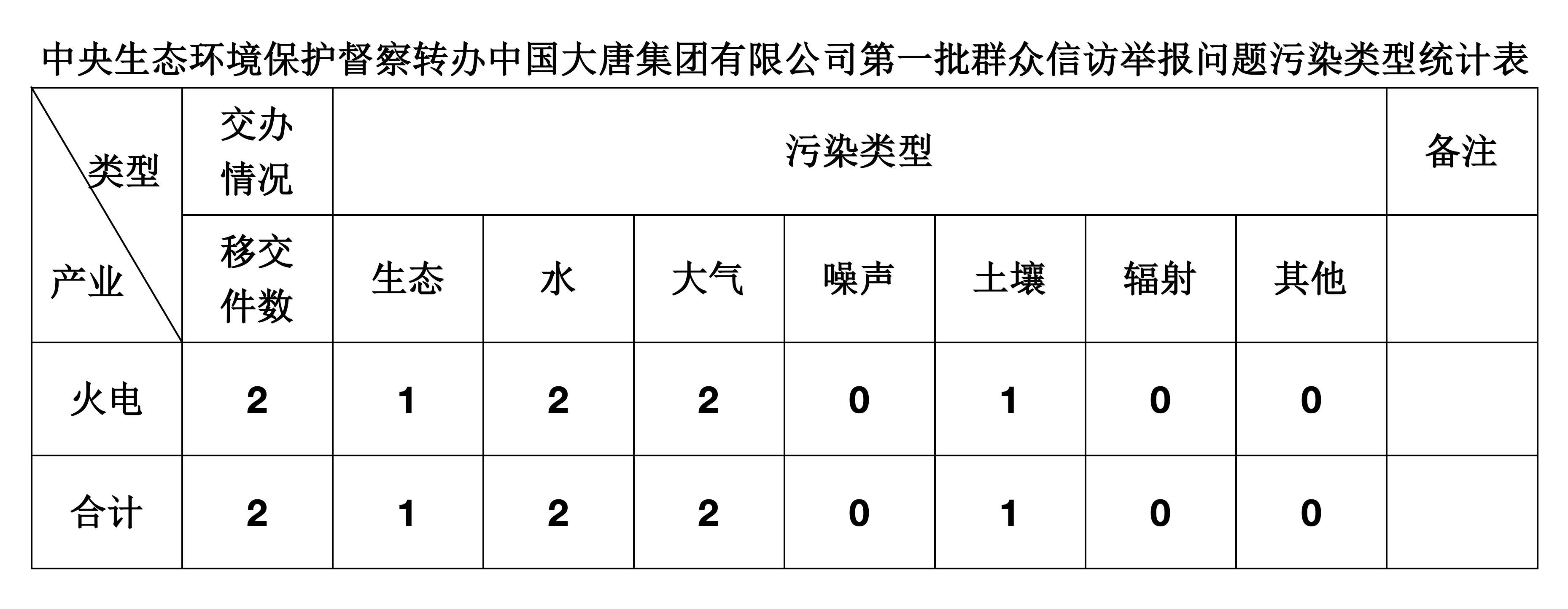 2025年5月30日,中央第七生態(tài)環(huán)境保護(hù)督察組向中國(guó)大唐集團(tuán)有限公司移交第一批群眾信訪舉報(bào)件,共計(jì)2件,均為來(lái)電舉報(bào)件,涉及生態(tài)問(wèn)題1個(gè)、水問(wèn)題2個(gè)、大氣問(wèn)題2個(gè)、土壤問(wèn)題1個(gè)。所有舉報(bào)件辦理工作已第一時(shí)間進(jìn)入調(diào)查核實(shí)辦理程序,辦理情況將按照相關(guān)要求反饋督察組,并及時(shí)向社會(huì)公開(kāi)。